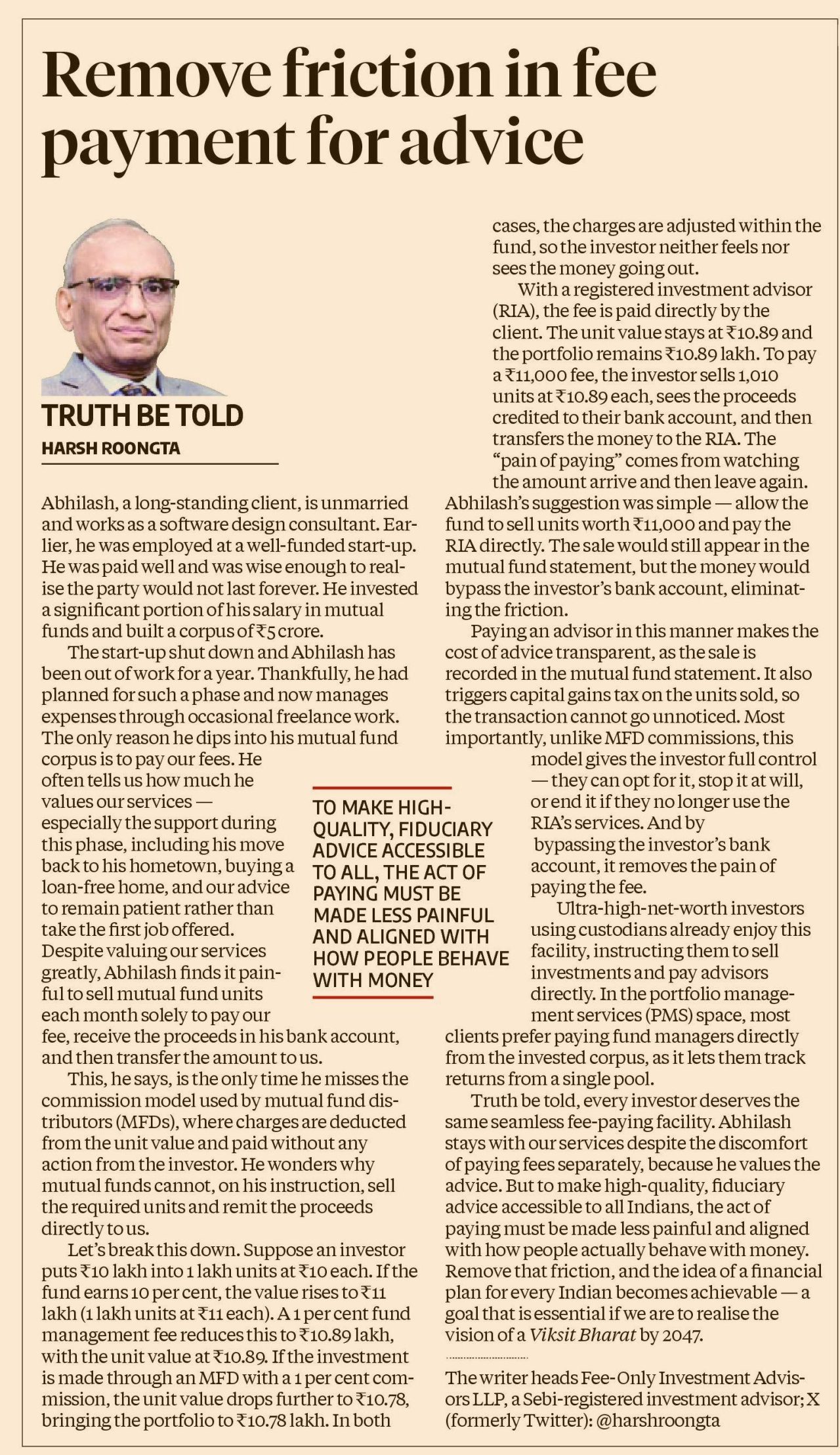 The writer heads Fee-Only Investment Advisors LLP, a Sebi-registered investment advisor; X (formerly Twitter): @harshroongta to make high quality, fiduciary advice accessible to all, the act of paying must be made less painful and aligned with how people behave with money