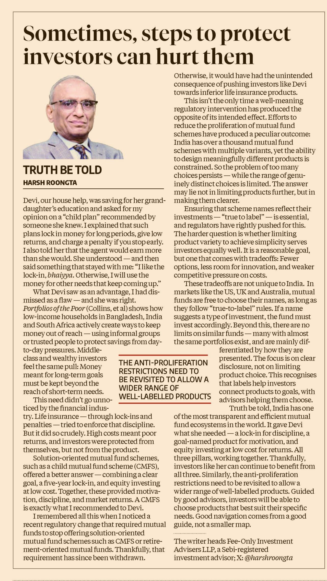 It gave Devi what she needed a lock-in for discipline, a goal-named product for motivation, and equity investing at low cost for returns. All three pillars, working together. Thankfully, investors like her can continue to benefit from all three. Similarly, the anti-proliferation restrictions need to be revisited to allow a wider range of well-labelled products. Guided by good advisors, investors will be able to choose products that best suit their specific needs. Good navigation comes from a good guide, not a smaller map.